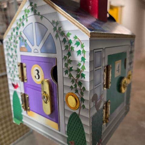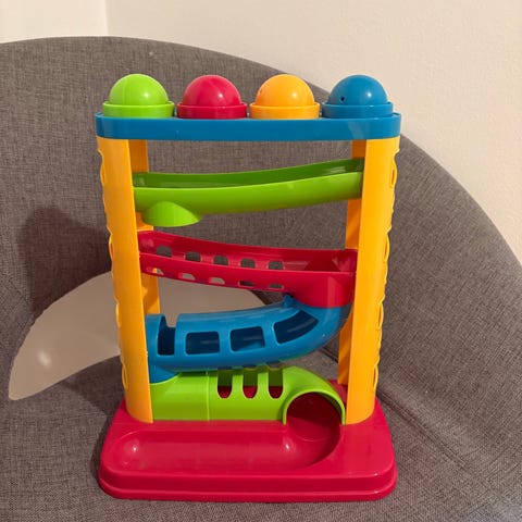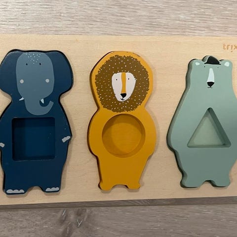 Aarikka barnespill i tre med fargerike geometriske former. Passer for barn og kan brukes til lek og læring av former og farger.