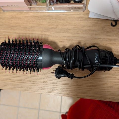 Denne varme børsten er kun åpnet , aldri brukt. Kjøpte to men trenger bare den ene. Den er hvit og rosa som bildet viser, samt rosa kam og klyper. Kjempe grei til halvlangt hår og den får plass i veska.