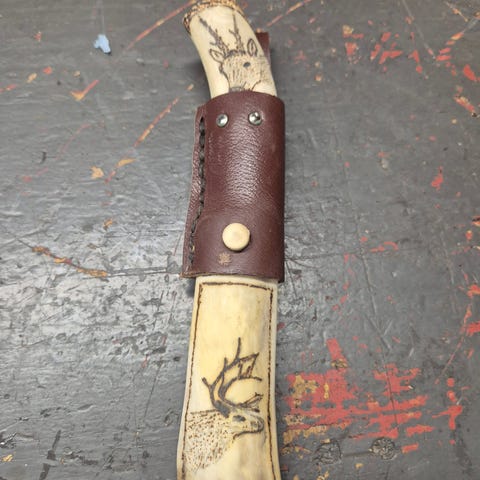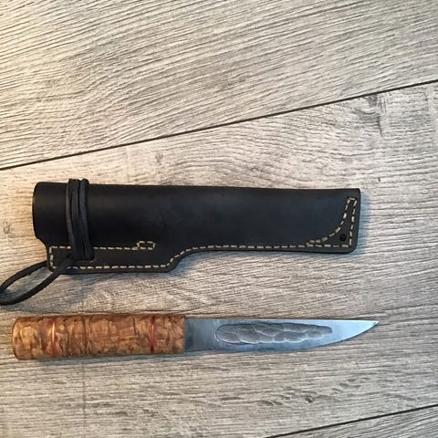 Har 2 mini kniver i sliren. Slire av tre innbundet i solid råhudslær.