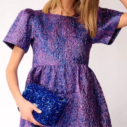 Gjør deg klar for sesongens fester med denne søte babydoll-kjolen fra Noella. Maine Taylor Dress har korte, vide ermer med puff-skuldre og rund hals. Kjolen har snittlinje i midjen og kort skjørt med volum og volangkant. Laget av teksturert, lett stivet jacquard-stoff i gull og sølv. Knappelukking i nakken.