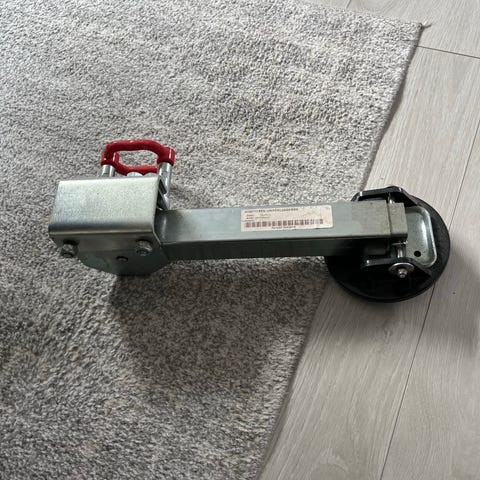Hurtig støttebein/jekk for henger. Kan brukes manuelt med sving arm eller bruke muttertrekker med pipe. Kjøpt i usa for ett år siden. Ikke fått satt den på hengeren min da jeg ikke har mulighet til å tilpasse min henger så denne passer på.
