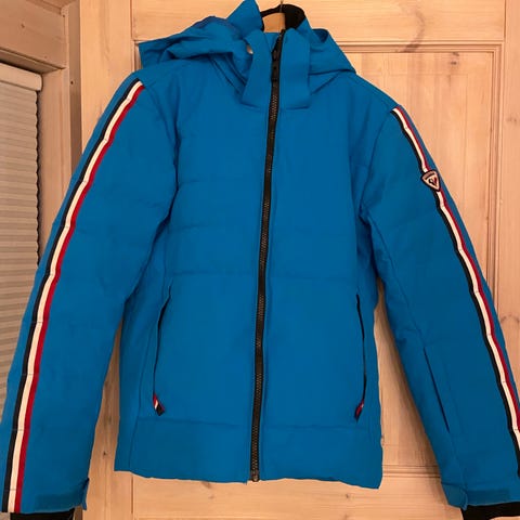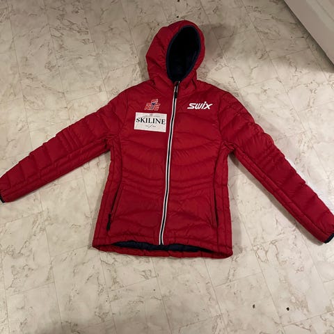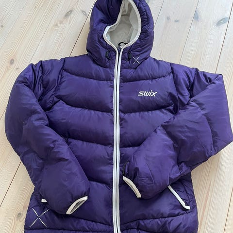 Swix dunjakke for dame i størrelse S/M. Jakken er svart og har hette. Strikken nederst er blitt dratt ut, men kan trolig fikses, har ikke prøvd.