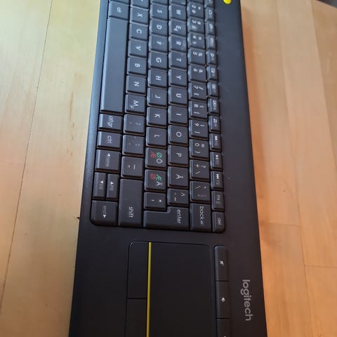 Logitech K400r trådløst tastatur med integrert touchpad. Tastaturet er et tilleggsutstyr for datamaskiner, designet for trådløs tilkobling og enkel navigasjon uten behov for separat mus.