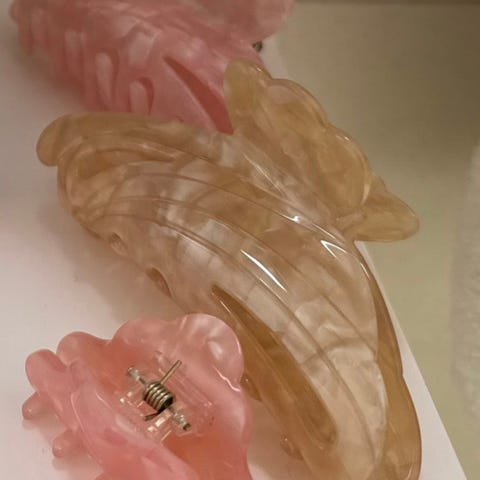 Sett med 3 hårklyper i hard plast i forskjellige farger: beige, blågrønn og rosa. Hårklypene har ulik størrelse og design, egnet for å holde hår på plass. helt ny ubrukt!