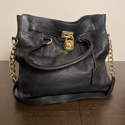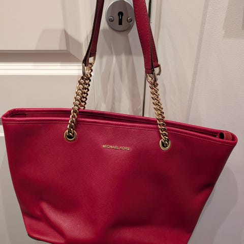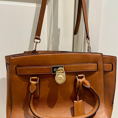 Naturfarget lærveske, med lys rosa stropper, fra Michael Kors. Vesken er i god stand, ingen synlige bruksmerker på selve vesken, noe slitasje på selve bæreremmene.