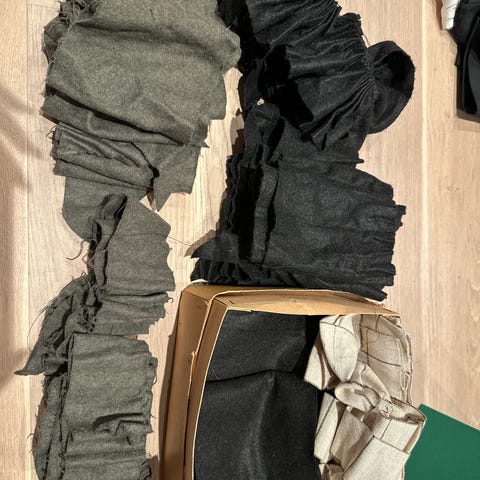 Påbegynt forkle og noe pyntebånd og bomullstoff til baksiden på forkle.