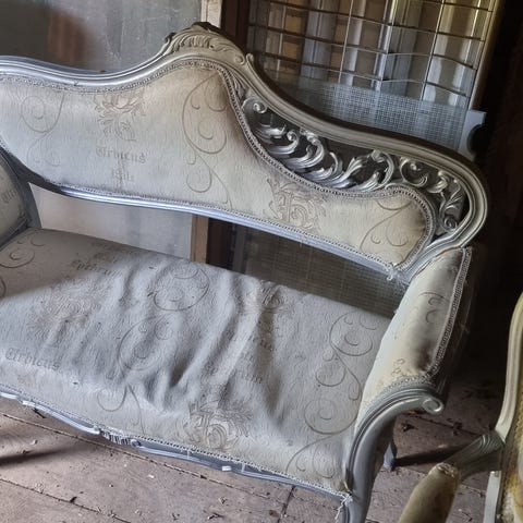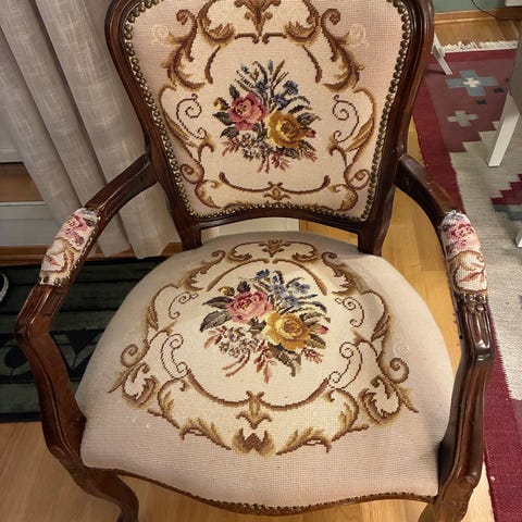 2 stk stoler i rokokkostil. Trukket i rødt fløyelstoff. Dekorative utskjæringer i treverket. Trenger litt kjærlighet for å skinne igjen.