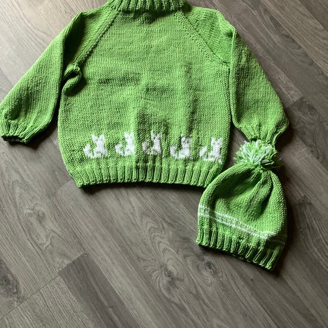 Meget pent og mykt hjemmestrikket sett!
