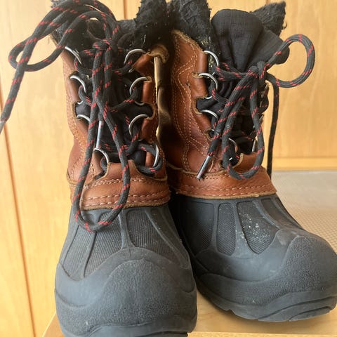 Sorel barn vintersko i størrelse 34, unisex. Skoene er svarte og laget med materialer som sikrer vanntetthet. Egnet for bruk i kalde og våte forhold, med solide såler for godt grep. Litt slitt under hælene, men mye bruk igjen.