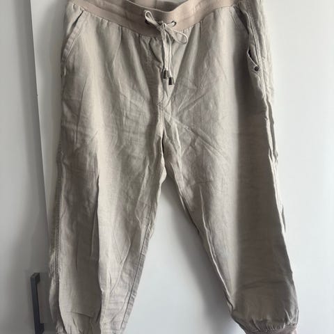 Bukse til sommeren med høyt liv knepping og plass for belte. Beige med svarte striper. Viskose/Lin blanding. Lommer frem. M