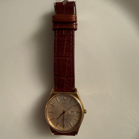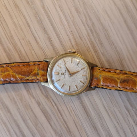 Omega herreklokke med gullfarget urkasse og brun flettet skinnrem. Klokken har en rund urskive med datovisning og analog visning. Passer for herrebruk. Stopper og går vet ikke hva feilen er.