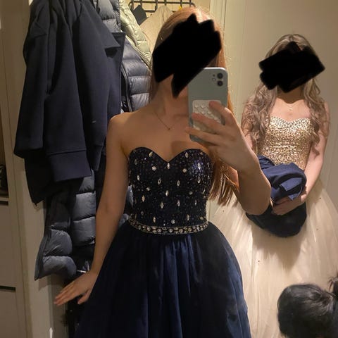Nydelig mørkeblå ballkjole selges. Flere lag med tyll i skjørtet. Paljetter på overdelen. Korsettsnøring i ryggen, slik at den kan passe fra XS-L. Passer opptil 175 cm høyde - kan evt legges opp. Svært pent brukt.