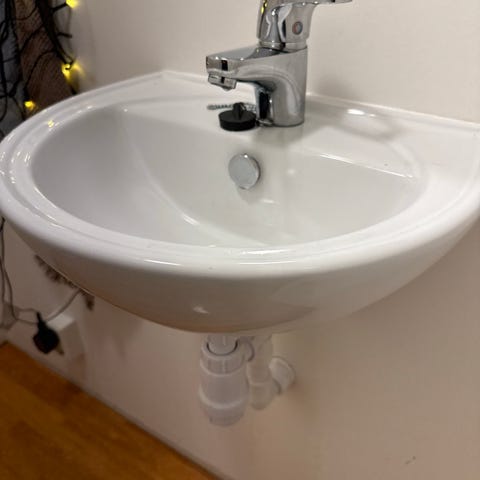 Servant med nokså nytt blandebatteri og tilhørende avløpssystem. Produktet inkluderer slanger for vanninnløp og avløp. Egnet for baderom med standard installasjonsbehov.