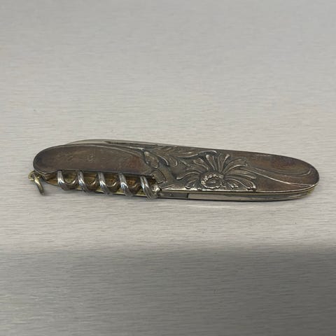 Lommekniv sølvstempel. kniv med dekor! Kniven har en bladlengde på cirka 7 cm. Passer til ulike bruksområder som skjæring og hobbyarbeid.det er inngravert to bokstaver på den ene siden og en dato på den andre siden! Denne er sa 60 år gammel