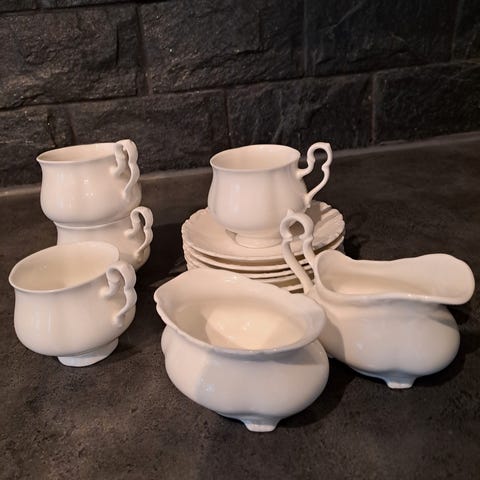 Hvit porselens kaffekoppsett som inkluderer kaffekopper, skåler, fløtekanne og sukkerskål.