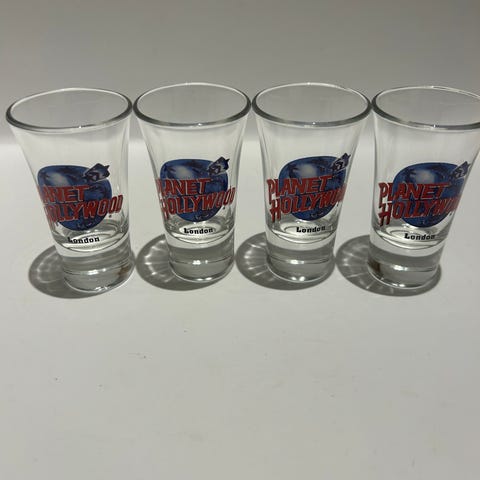 2 Planet Hollywood Shotglass. Glassene er laget i klart glass med Planet Hollywood-logo og tekst i farger. Passer til servering av små mengder drikke.