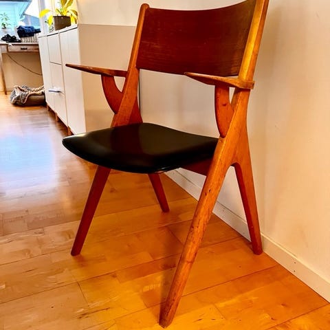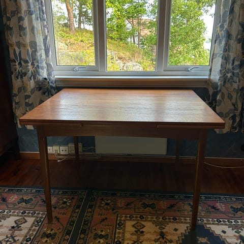 Bordet trenger litt pussing og teakolje. Det er fra 60-tallet, men har holdt seg godt og er både bastant og langt, når du drar ut lemmene. Bordet kan taes helt ifra hverandre, så det er enkelt å flytte på hvis du trenger det. Bordplaten kan taes rett opp, men den veier jo litt, men en voksen person orker det. Jeg tenker at 3600 med 4 stoler, kan være en grei pris. Stolene er kjøpt på Jysk og veldig gode å sitte på. De er av nyere dato, men husker ikke hvor gamle de er. Jeg skal sette inn flere bilder i morgen.