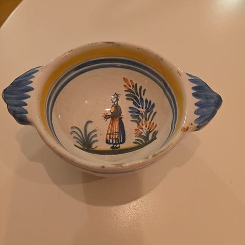 Sett med 5 vintage fajansetallerkener fra HB Henriot Quimper (Bretagne, Frankrike) med klassiske bretonske figurer og blomsterdekor. Håndmalt uttrykk – veldig fine både til servering og som veggdekor.