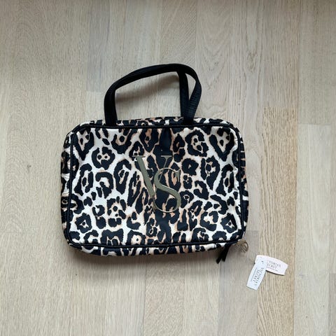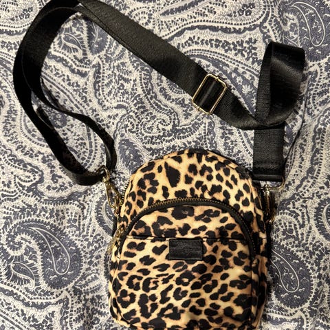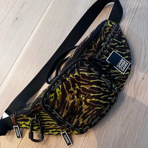 Ganni stoff veske med leopardmønster, designet for unisex bruk. Vesken har glidelås og et romslig innvendig rom. Materialet er stoff, og vesken har et mønster som etterligner leopardpels.35cm lang