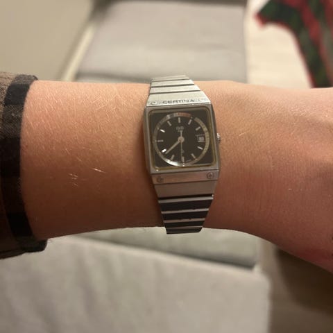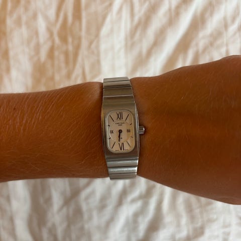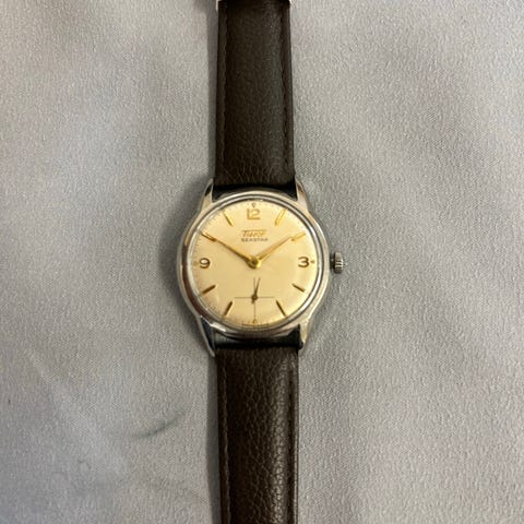Raymond Weil unisex klokke med rund urskive og svart lærrem. Klokken har en klassisk design med gullfarget urkasse og romertall på urskiven.