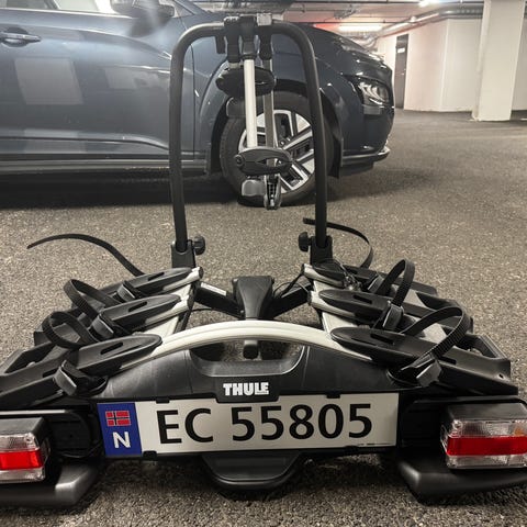Thule sykkelstativ for bil med plass til fre sykler. Stativet har låsemekanisme for sikker montering på bil og er laget av metall med plastdetaljer. Passer til transport av sykler på bilens bakside.