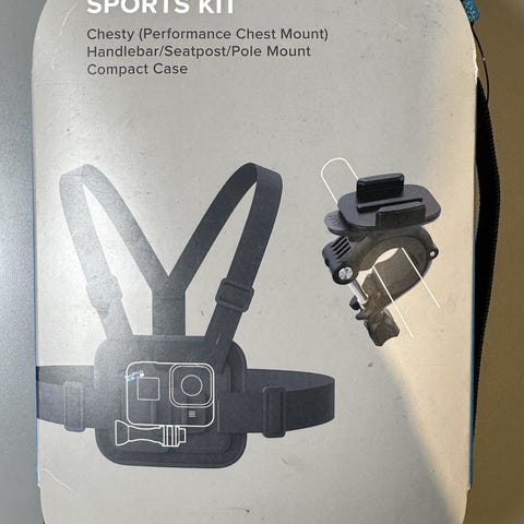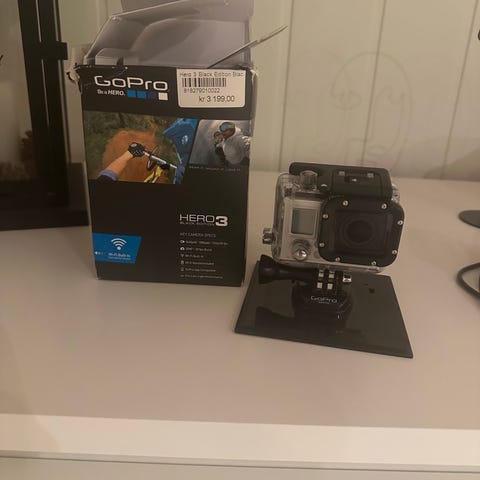GoPro HERO3+ actionkamera med vanntett hus og flere monteringsutstyr inkludert. Kameraet er designet for å filme i høy kvalitet under ulike forhold, egnet for utendørs og sportsaktiviteter.