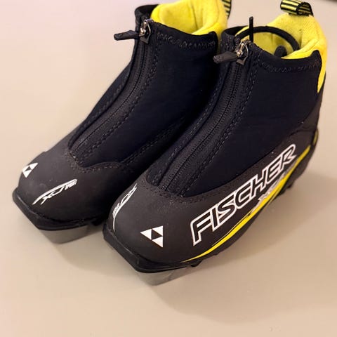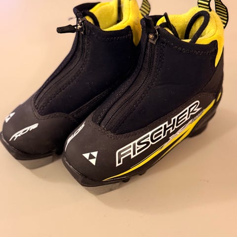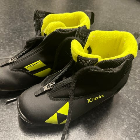 Fischer XJ sprint skisko i svart og gul farge. God komfort for barn, str. 30. pent brukt