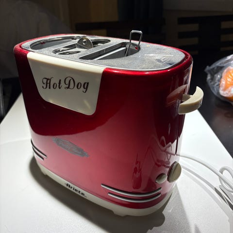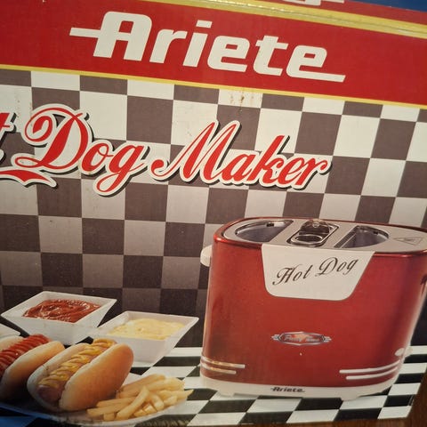 Ariete Hot Dog-maskin i rød farge. Maskinen er designet for å varme og tilberede pølser og brød. Den har et kompakt design som passer til kjøkkenbenken.