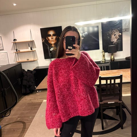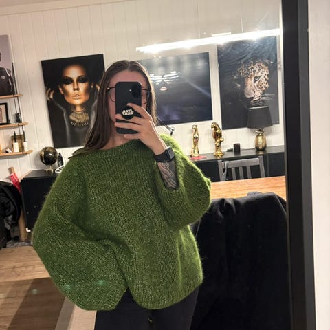 Selger en ubrukt, hjemmestrikket genser da jeg har for mye strikkegensere og må selge unna litt. Har brukt oppskrift fra Dreamknit og dobbel tråd Skappel suri norsk lamull garn i en fresh grønnfarge (#1025). Overvidden er ca 126 cm og lengde ca 57 cm. Den har en digg oversized fit og har vide armer. Siden det er hjemmestrikk så kan skjønnhetsfeil forekomme, men prisen er satt deretter :) Prisen diskuteres IKKE, da den allerede er lavere enn garnkostnaden.