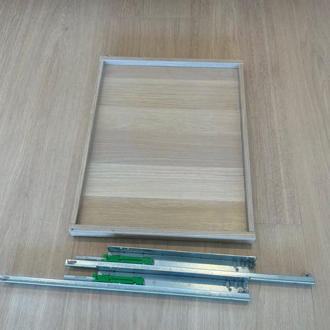 Tre uttrekkbare hyller i Komplement‐serien fra IKEA. Passer til PAX-garderobe. Skinner og skruer følger med. Selges ny for 350 kr per stk på IKEA. Selger alle tre for 300 kr tilsammen.