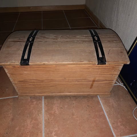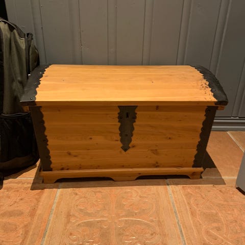 Denne kista er 30cm Bredde,30cm høyde å 30 dybde.har vært brukt for å ha plante oppå.kista er fin å hel.kan fint oppbevare ting i den.