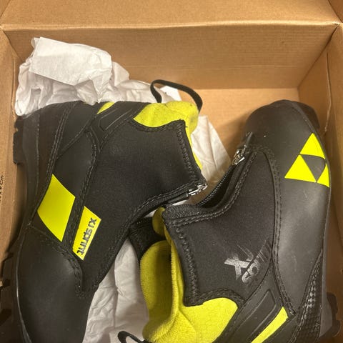 Fischer XJ Sprint skisko for barn i svart og gul. Skoene har en lukket design med glidelås foran, egnet for barn som skal lære langrenn. Fargene er svart med gule detaljer.. pent brukt, størrelse 28.