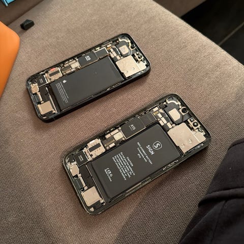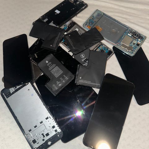 Apple Annet telefonutstyr bestående av flere deler til iPhone, inkludert bakdeksler, skjermer og interne komponenter i forskjellige farger og modeller.