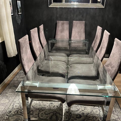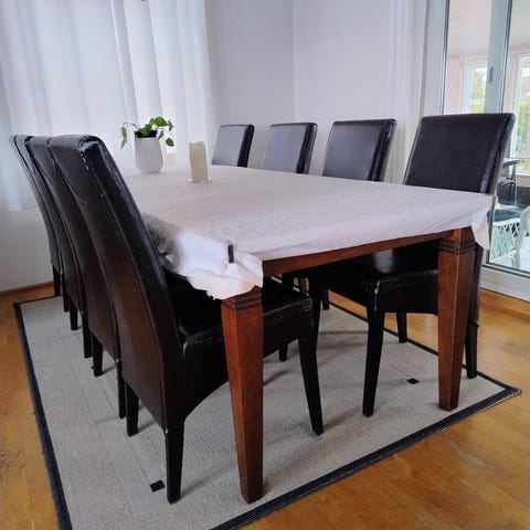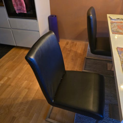 Dette er stoler som passer til spisebordet. De er 44,5 cm brede på setet foran og 39 cm, der hvor ryggen begynner. Stolene er 96,5 cm fra ryggen og ned. De er sorte, men ikke skinn. Bena er av rustfritt stål. Disse stolene er veldig gode å sitte på, desverre så har jeg kjøpt et annet bord, så derfor har jeg ikke plass til disse stolene. De kostet over 1000 kr. stk da jeg kjøpte dem, så jeg tror 300 er en grei pris, kom gjerne og prøv dem og eller kom med bud.