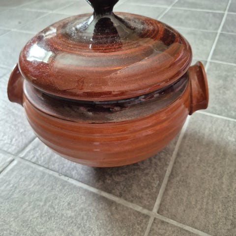 Dette er en glasert keramisk leirgryte med et lokk som rommer 3 liter. Disse fatene er verdsatt for sin evne til å fordele varmen jevnt og holde på den lenge, noe som gjør dem ideelle for langsom matlaging, som gryteretter, supper eller risretter. Gryten er rund, en gryte med håndtak på sidene og et lokk med små hull for at dampen skal slippe ut. Når man lager mat i en leirgryte, koker maten i sin egen saft, noe som bevarer flere næringsstoffer og opprettholder en rikere smak.