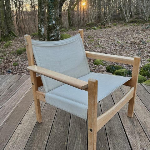Futurum-lenestoler i mørkbeiset furu med beige ullputer, designet av Jens og Adolf Relling for Sørlie Møbler.