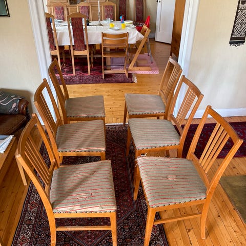 Rammen med bein og ileggsplatene er i massiv eik. Dette gjør at man kan slipe og overflatebehandle etter eget ønske, uten å være bundet til eksisterende farge på maling eller lakk.