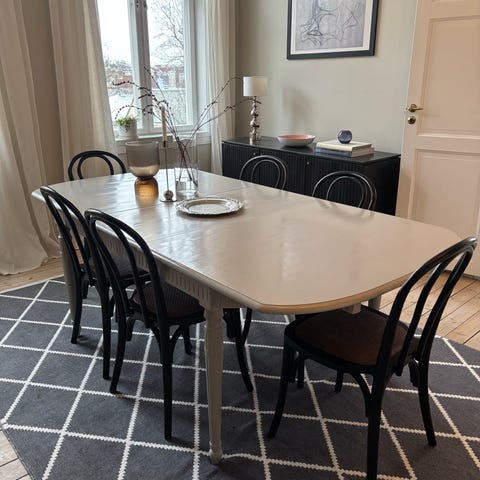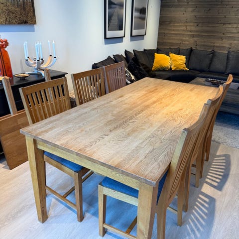 Under flytteprosessen ble benkeplaten til spisebordet vårt skadet og ødelagt under transport, og blitt kastet. Derfor selges kun ramme med bein samt 2 stk. ileggsplater,