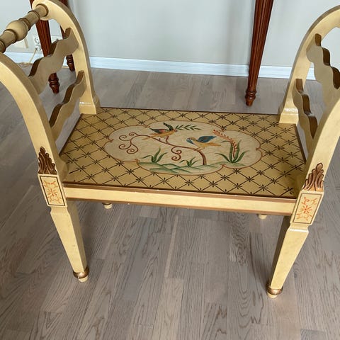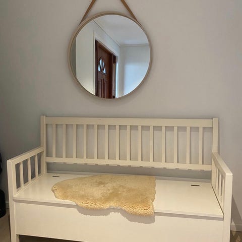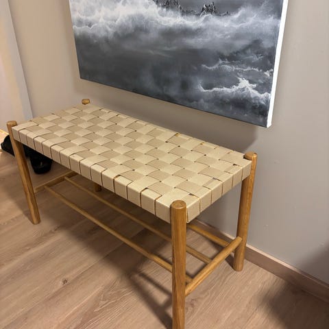 Benk med sorte metallbein fra Lindas dekor. Fargen heter steingrå, men det er en blanding av beige og grå. Kjøpt i midten av desember, vi selger den fordi de sorte bena ikke passer inn hos oss. Nypris hos Lindas dekor: 1299kr. Kvittering medfølger selvsagt. Den har stått i yttergangen hos oss de siste ukene, men det er ingen bruksmerker og den fremstår som helt ny