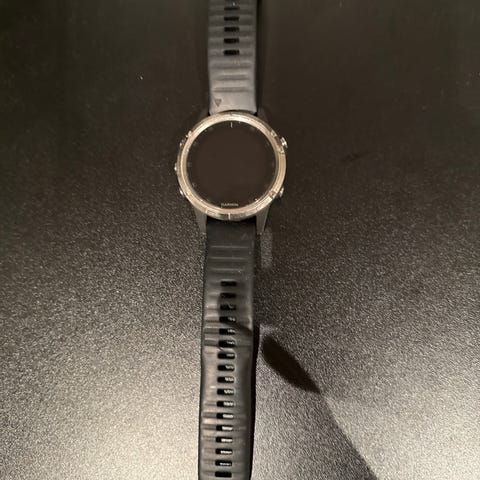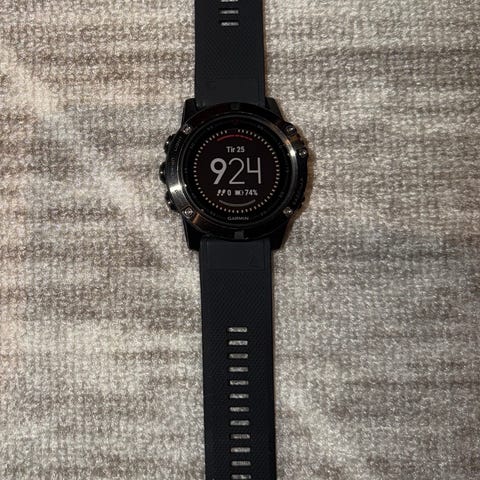 Garmin Fenix 5x smartklokke med svart urskive og svart/rød silikonrem. Klokken har flere funksjoner for trening, helse og navigasjon. Passer for brukere som ønsker en robust og funksjonsrik smartklokke.