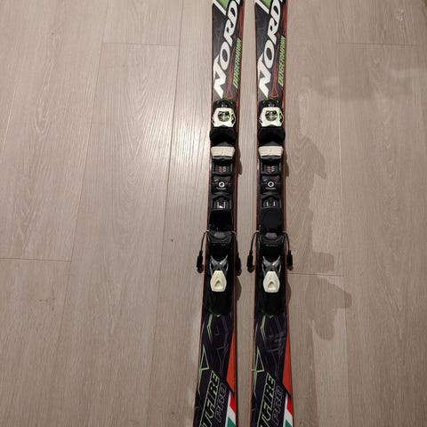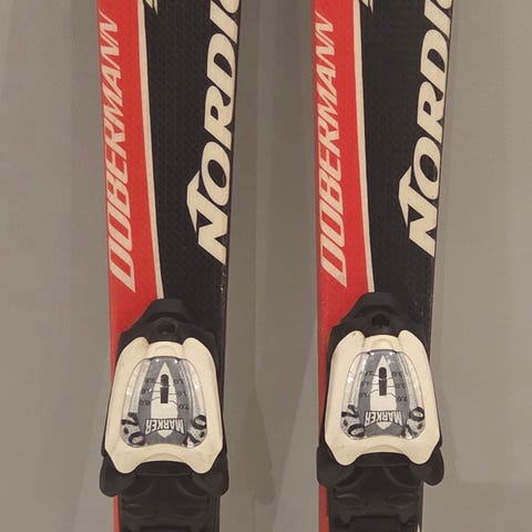 Nordica Dobermann SL alpinski i blå og hvit farge. Skiene har bindinger montert og er egnet for slalåmkjøring. 80 cm