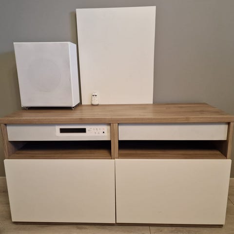 Hel og pen TV-benk / kommode med glassplater innvendig og glassplate på toppen.
