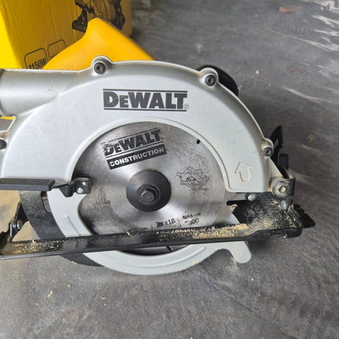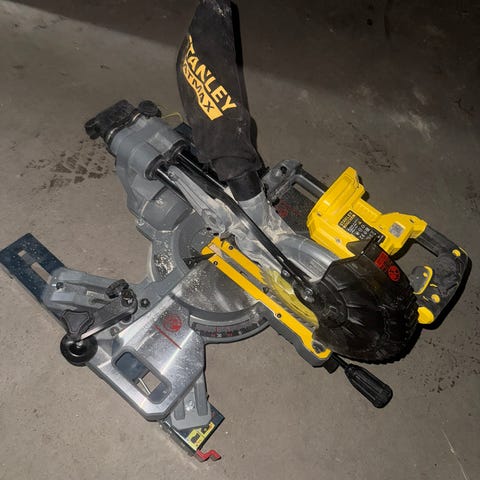 DeWalt DW713 kapp- og gjærsag med elektrisk motor. Sagblad og måleinnstillinger for presise kutt. Egnet for trebearbeiding og byggeprosjekter.