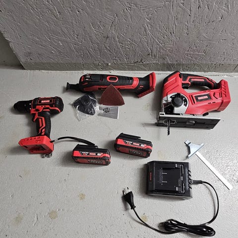 Lader følger med, og selvfølgelig batterier til maskinene. Alt i 18v 4,0ah