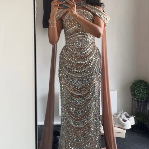 Nydelig og eksklusiv aftenkjole i champagne-/nudetone med vakre perle- og paljettdetaljer. Kjolen har en figurnær overdel, høy hals og gjennomsiktige ermer i myk tyll som gir et elegant og luksuriøst uttrykk. Skjørtet faller lett og luftig med glitrende vertikale detaljer som gir en slankende effekt.