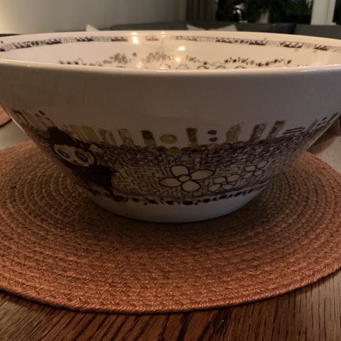 Denne er laget av stål tror jeg.Kan brukes til å ha frukt i eller andre ting i.