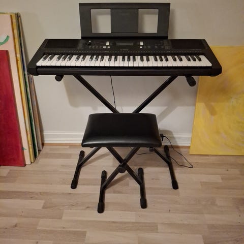Yamaha keyboard med 61 tangenter. Elektronisk musikkinstrument med innebygde høyttalere og flere lydinnstillinger. Passer for nybegynnere og viderekomne brukere.