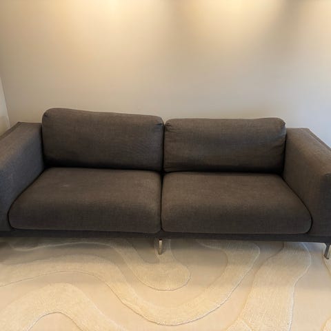 Jeg selger vår nyrensete Nockeby sofa fra IKEA, i en elegant grå tone som passer inn i ethvert moderne hjem. Med en sjenerøs bredde på 253 cm og en dybde på 100 cm, tilbyr denne sofaen komfortabel sitteplass og et middels fast/mykt sitteunderlag som er perfekt for lange filmkvelder eller avslappende ettermiddager. Den komplette tilstanden, fri for røyklukt og dyrehår, samt minimale bruksmerker på bena, gjør denne sofaen til et attraktivt og praktisk valg