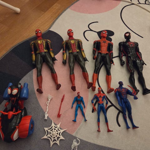 Spidey, miles morales, ghost spider, iron man, black panter, hulken, rhino, elektro, black cat, green goblin og miss Marvel. Forskjellige kjøretøy. Send en meld om hvass evt ønsker så finner vi en pris 😊