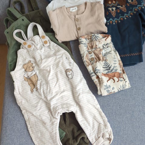Samt en onepiece, kjole, vest, og en fleece som jeg er usikker på størrelsen på.